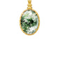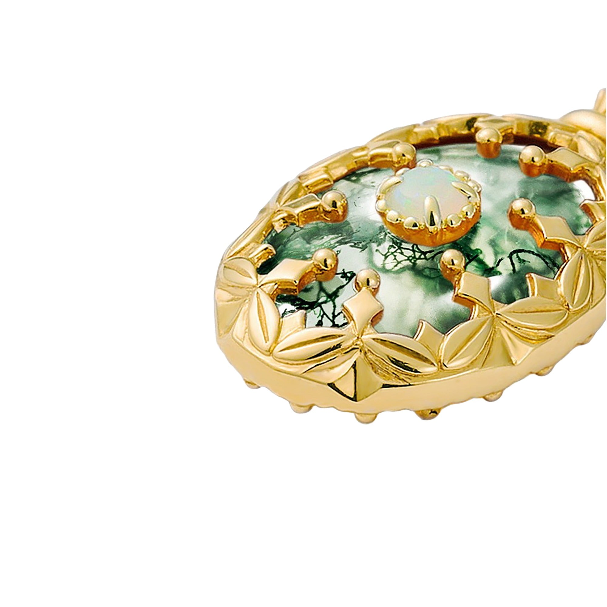 The oval moss stone acts as a "vintage forest locket" core, with its unique veins making each piece one-of-a-kind. The gold openwork setting’s detailed edges add depth, the central iridescent stone brings dynamic shine, and the carved bail ties the design together—turning a natural fragment into an ornate, wearable treasure.